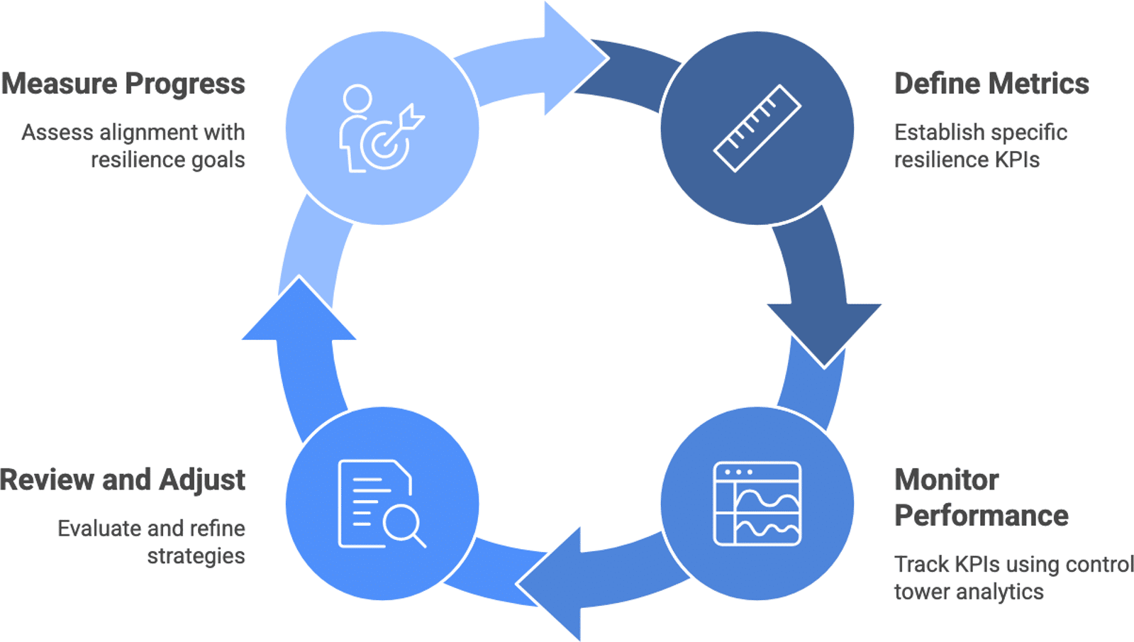Success is monitored using tailored metrics specific to resilience aspects, like crisis response time, recovery rates, cybersecurity breach prevention, and staff adaptability. KPIs for supply chain efficiency, IT integrity, and community collaboration are tracked through control tower analytics, providing evidence-based feedback for continuous improvement. Regular reviews and adjustments ensure strategies stay relevant, adaptable, and aligned with resilience goals, allowing consistent progress measurement and strategy refinement.